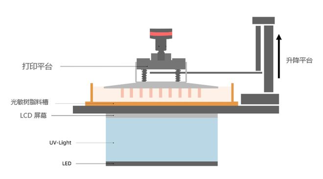 首先,3D模型會(huì)被3D打印軟件橫向地切成一層層,然后投影機(jī)會(huì)把第一層模型的形狀圖案投射到液態(tài)光敏樹脂上,然后進(jìn)行光固化及成型。第一層完成后,便會(huì)將物件稍微升高,然后投射下一層模型的形狀圖案到光敏樹脂上,層疊式地打印出模型。