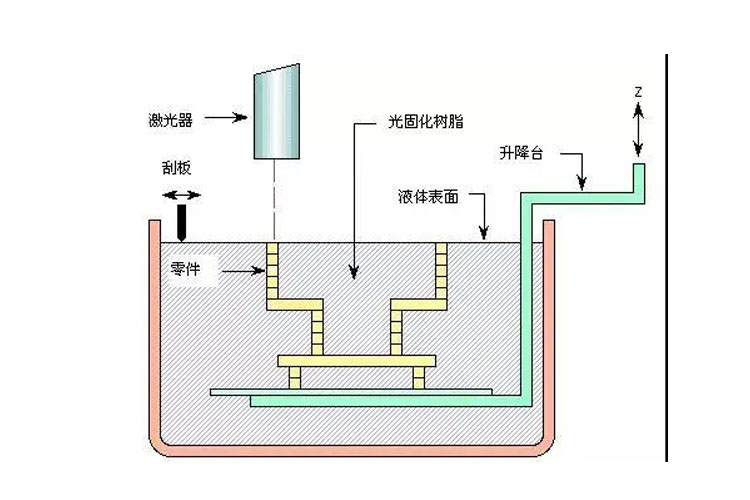 打印之前在樹脂槽中盛滿液態(tài)光敏樹脂,可升降工作臺(tái)處于液面下一個(gè)截面層厚的高度,聚焦后的激光束在計(jì)算機(jī)控制下沿液面進(jìn)行掃描,被掃描的區(qū)域樹脂固化,從而得到該截面的一層樹脂薄片;升降工作臺(tái)下降一個(gè)層厚距離,液體樹脂再次暴露在光線下,再次掃描固化,如此重復(fù),直到整個(gè)產(chǎn)品成型;升降臺(tái)升出液體樹脂表面,取出工件,進(jìn)行相關(guān)后處理,通過強(qiáng)光、電鍍、噴漆或著色等處理得到需要的最終產(chǎn)品。